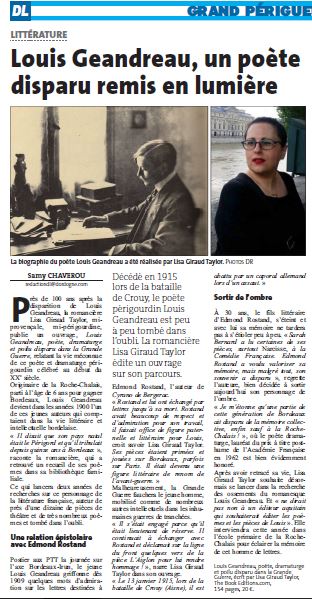 « Louis Geandreau est né à la Roche-Chalais en Dordogne en 1885. Garçon modeste et particulier, il vivait paisiblement et écrivait de la poésie et du théâtre en vers. Ses écrits sont restés quelque part dans les greniers de nos grands-parents, dans certains vieux livres ou dans les vieilles bibliothèques perdues dans les cantons environnants.